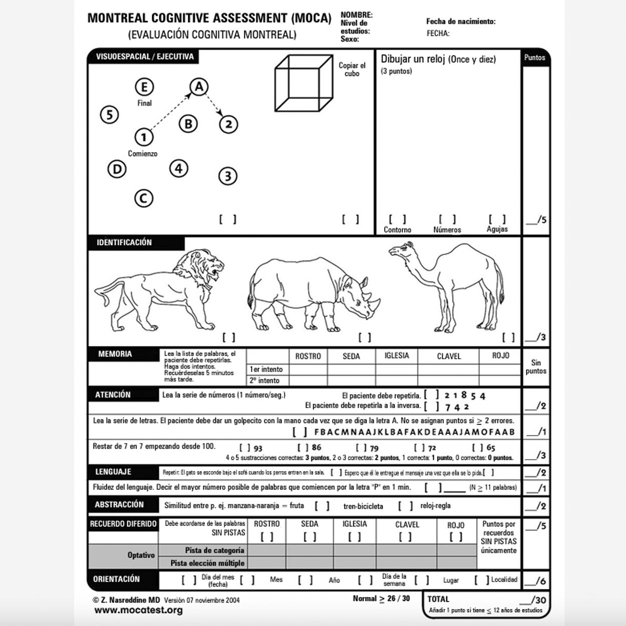 Esta prueba mide la concentración, la atención, la memoria, el lenguaje, los cálculos, la orientación, las funciones ejecutivas y las habilidades visuales.