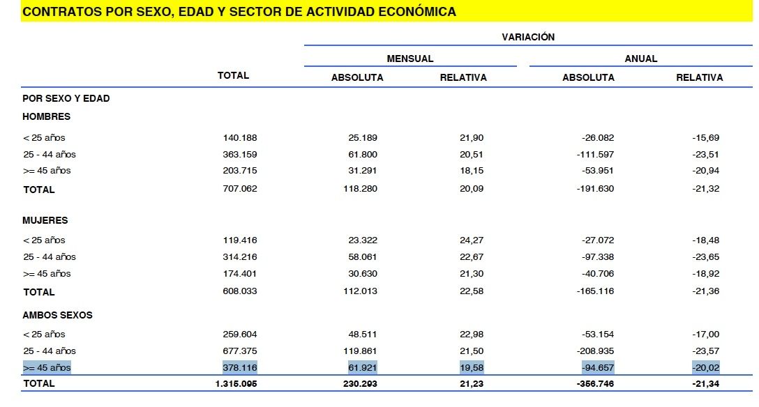 No obstante, esos 378.000 contratos en marzo representan asimismo una destrucción de 94.657 empleos sénior respecto a hace un año (el -20,02%), puesto que en marzo de 2022 los mayores de 45 años rubricaron 472.773 contratos, y un año antes, marzo de 2021, habían logrado 400.260 empleos (ver tabla inferior).