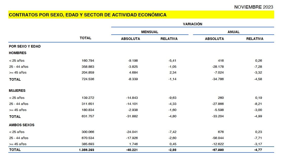 El deterioro de la contratación de mayores de 45 años es evidente, y así, los 12.622 puestos menos en relación con noviembre de 2022 suponen una caída de la contratación del 3,17% anual.