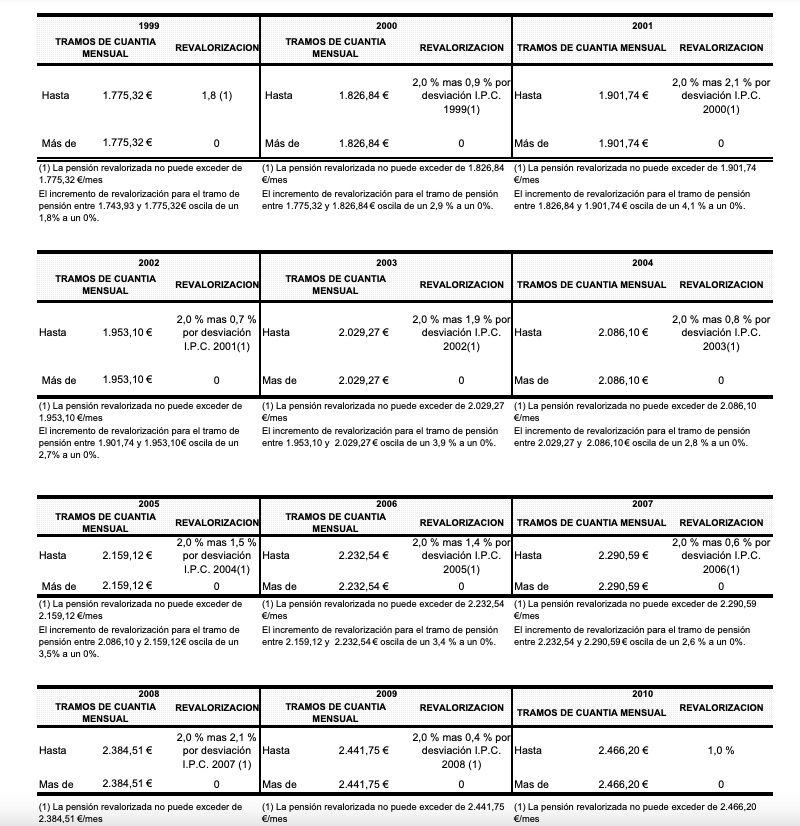 En 2013, las pensiones que no superaban los 1.000 euros mensuales se incrementaron el 2% y el 1% todas las que superaban la mencionada cifra. Por su parte, el incremento de las pensiones en 2012 fue del 1% generalizado, mientras que en 2011 tuvo lugar una subida de todas las pensiones del 1,3%, más una revalorización adicional de un punto en el caso de las prestaciones mínimas.
