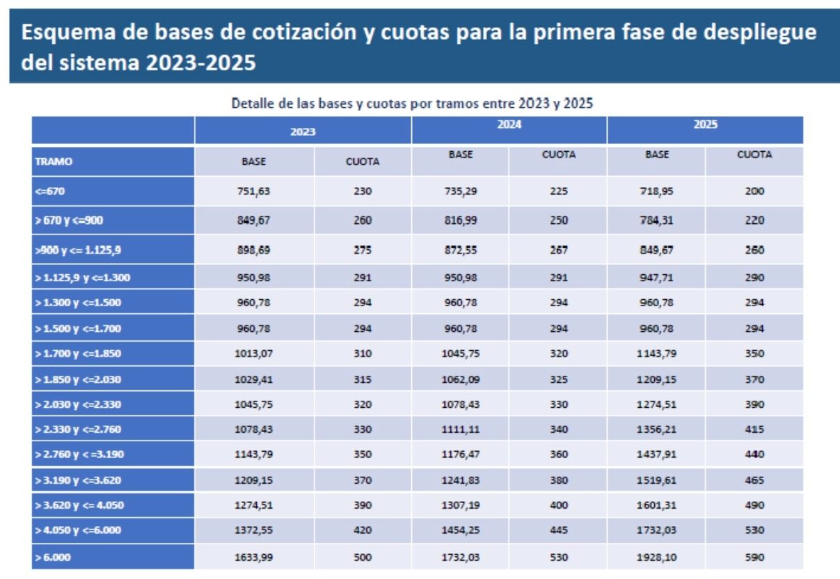 En 2023 entrará en vigor el nuevo régimen de cotización del RETA, con un sistema de 15 tramos de rendimientos netos a los que corresponden unas bases de cotización y unas cuotas mínimas en cada tramo. Así, desde el 1 de enero de 2023, se pagarán unas cuotas que irán desde 230 euros mensuales para quienes tengan rendimientos netos inferiores o iguales a 670 euros, hasta 500 euros mínimos al mes para quienes en 2023 presenten rendimientos netos superiores a los 6.000 euros.