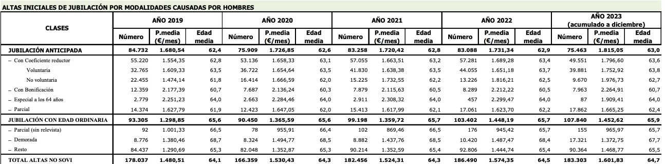 Mientras tanto, en los hombres, la edad media efectiva de jubilación es más baja que en las mujeres. En 2023, la de los varones fue de 64,7 años, por encima de los 64,5 años de 2022, pero sin alcanzar todavía esa cota de los 65 años de media que presentan las mujeres.
