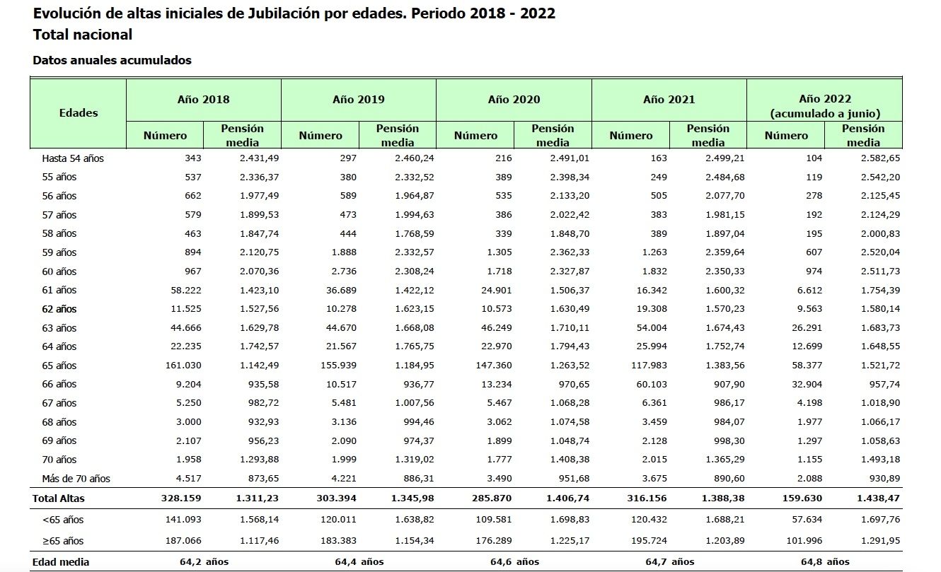 En lo que va transcurrido de año, prosigue la tendencia al retraso de la jubilación, que en el acumulado hasta julio de 2022 tiene lugar a una edad media de 64,8 años.