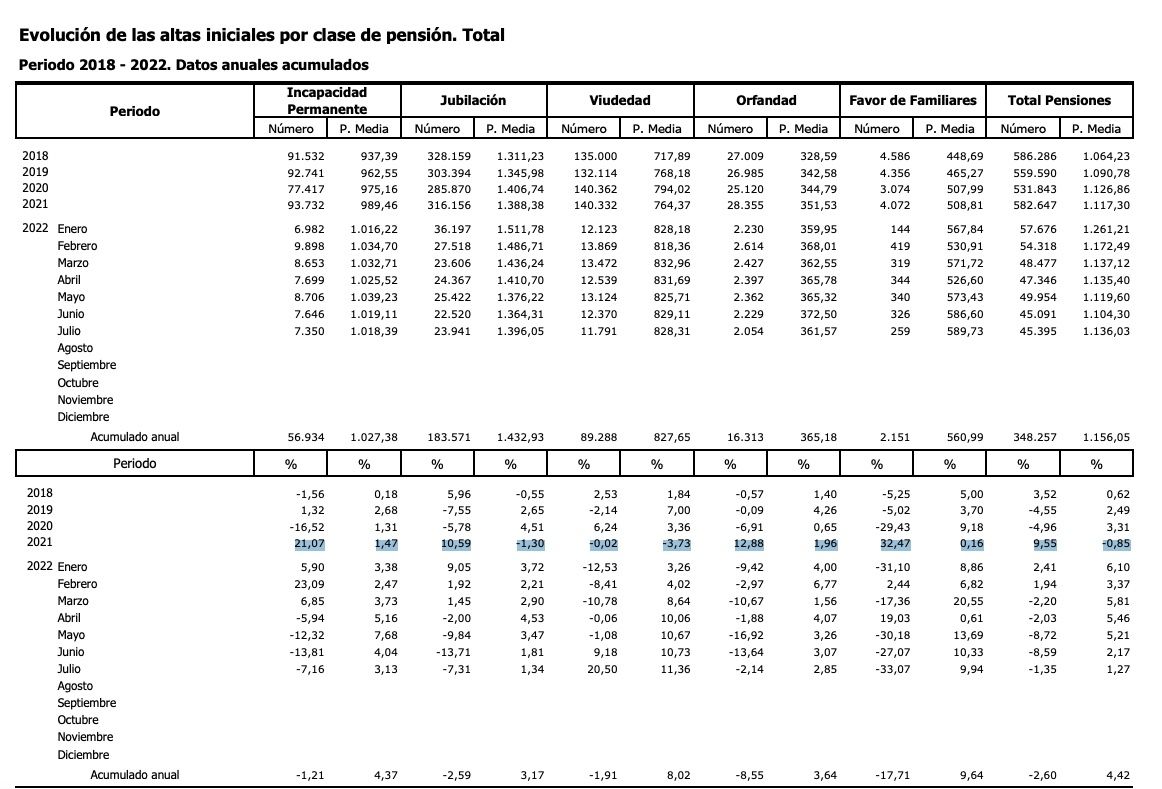 A falta de saber qué sucederá este año, los datos acumulados hasta julio de 2022 parecen indicar que los importes de todas las clases de nuevas altas aumentarán, ya que en los siete primeros meses de este ejercicio, la cuantía promedio que reciben los nuevos jubilados es de 1.432,93 euros mensuales, lo que significaría regresar a niveles de 2020. En ese caso, la Seguridad Social habría logrado frenar el fuerte ritmo de incremento en las pagas de los nuevos retirados, conteniéndolas, gracias a las medidas más rígidas de acceso a la jubilación.