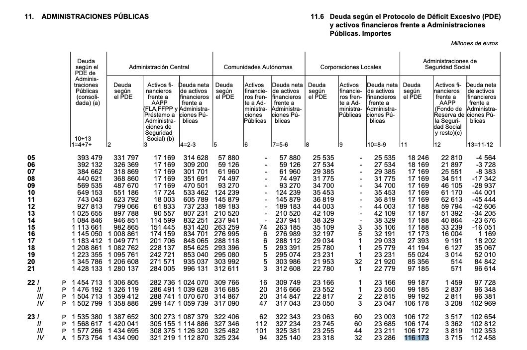 Si se desglosa la deuda por administraciones, la Administración Central la elevó a 1,43 billones de euros en diciembre de 2023, lo que representa el 98,1% del PIB. El crecimiento, en términos interanuales, de la deuda de este subsector en el cuarto trimestre fue del 5,5%.