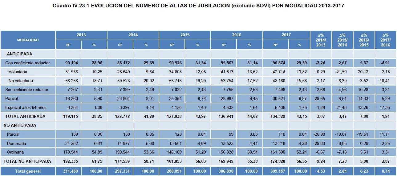 El freno de la jubilación anticipada comenzó ya en en el año 2017, con un descenso del 1,91% frente a 2016, rompiendo de esa manera los tres años anteriores consecutivos de subidas, puesto que desde 2014 a 2016 la cifra de nuevas altas de jubilación se había incrementado a un ritmo del 3,07%, 3,47% y 7,8%, respectivamente, según muestran las estadísticas de Seguridad Social (ver tabla inferior):