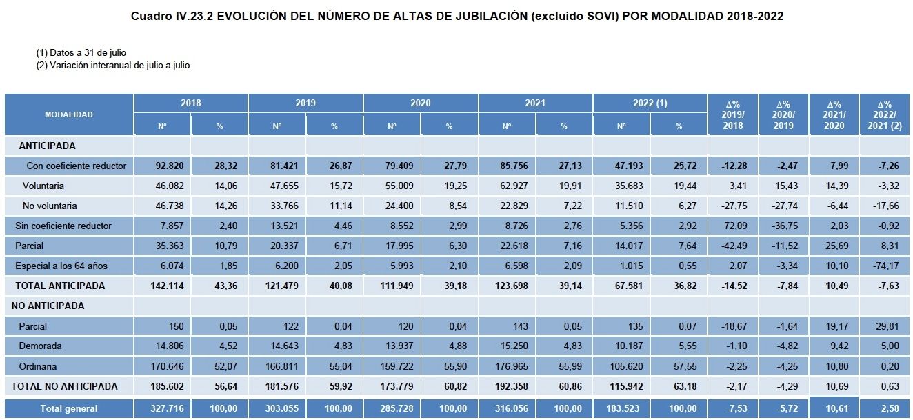 Más en detalle, entre los meses de julio de 2022 y 2021, el número de personas que se acogieron a la jubilación demorada creció el 5%, mientras que la cifra de altas en jubilación parcial se incrementó el 29,8%.
