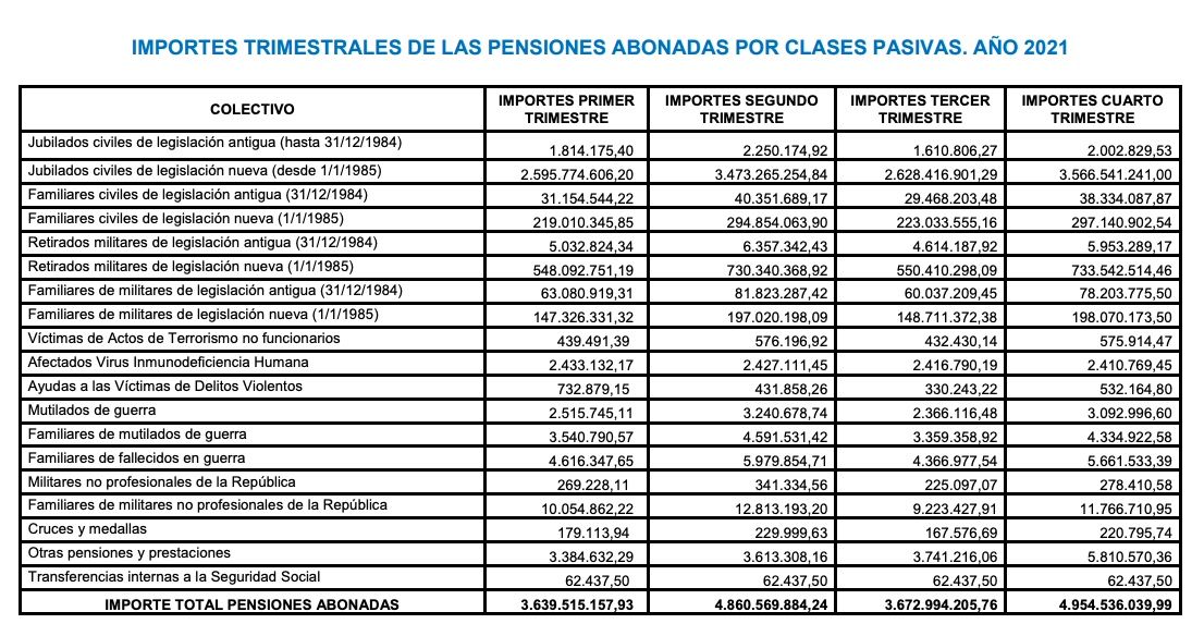 El gasto anual en este tipo de pensiones ascendió a 17.127 millones de euros en 2021, según refleja el Portal de Clases Pasivas, que muestra un desembolso trimestral en torno a los 3.600 millones, excepto en el segundo y cuarto del año, donde el abono de sendas pagas extraodinarias elevó el gasto hasta unos 4.900 millones al trimestre.