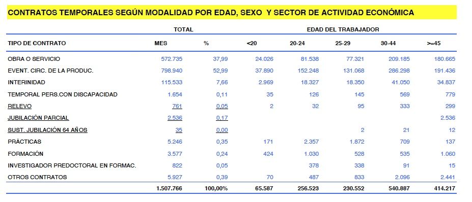 En cuanto a los contratos temporales realizados en diciembre pasado (más de 1,5 millones), los de jubilación parcial suman 2.536 (ver detalle en tabla inferior), que significan el 0,17% del total de los firmados en el último mes del año. Por su parte, los contratos por sustitución de jubilación a los 64 años totalizaron 35, mientras que los de relevo sumaron 761 (el 0,05%). Cifras todas ellas, tanto totales como relativas, bastante insignificantes.