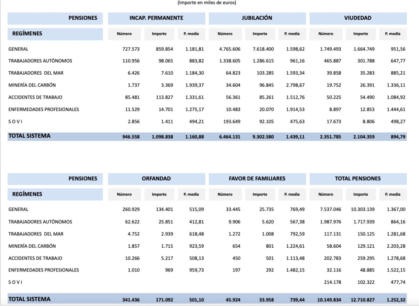Asimismo, en el total de pensiones que abona la Seguridad Social, los trabajadores autónomos también reciben las de menor importe: 864,16 euros mensuales, en relación con los 1.367 euros de pensión media en el régimen general o los 1.252,3 euros/mes que en promedio resulta ser la nómina que se abona en el total del sistema contributivo.