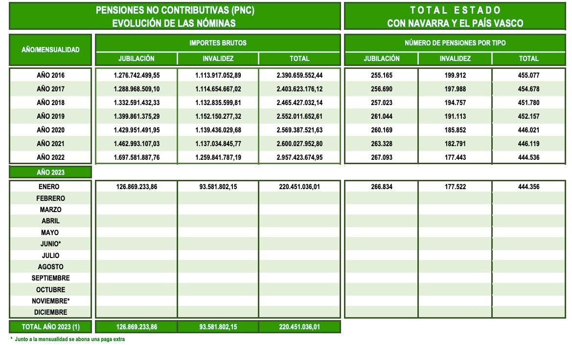 Por su parte, el número total de pensiones no contributivas en la nómina de enero de 2023 en todo el Estado español alcanza la cifra de 444.356 (el 0,04% menos que el mes anterior), con un coste de 220.451.036,01 euros para el Estado.