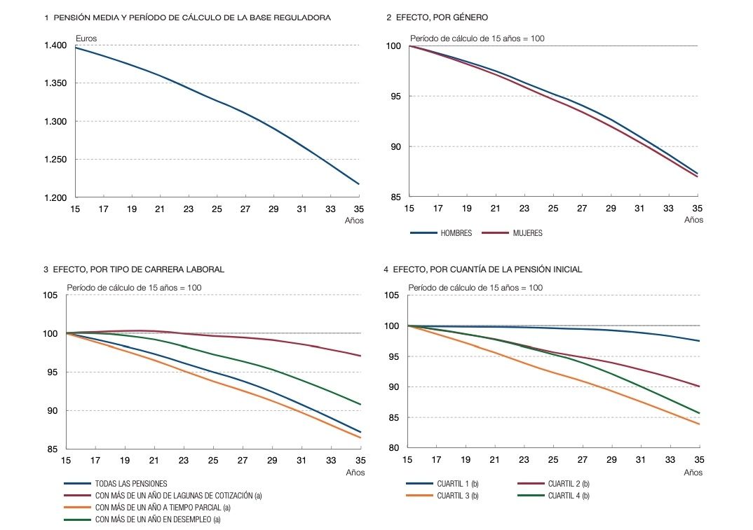 El Banco de España calcula, por ejemplo, que "tomar en consideración los 29 años más favorables dentro de los 35 previos a la jubilación arrojaría una pensión media similar (-0,1%) a la resultante de tomar en cuenta los 25 años anteriores". Además, esta forma de determinar la base reguladora produciría, en promedio, un incremento de la prestación inicial de las pensiones que se sitúan por debajo de la mediana (con respecto de un escenario en el que la base reguladora se calcula a partir de los 25 años anteriores a la jubilación) y una caída de la prestación inicial para las pensiones en el cuarto cuartil de la distribución (las más altas).