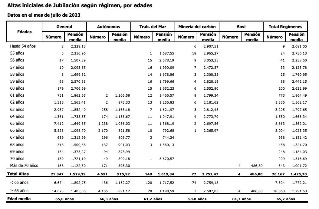 De ese total de 26.167 nuevas altas en julio, más de 16.600 tuvieron lugar entre los 65 años (esta opción permite cobrar el 100% de la pensión a quienes tengan 37 años y 9 meses cotizados) y los 66, prácticamente en la misma proporción, aunque con pagas muy distintas (ver gráfico superior). Pero, además, existe un numeroso grupo de jubilados anticipados, a los 63 años (3.225 personas en julio), a los 64 años (1.550 nuevas altas en el séptimo mes) y a los 62 años (1.336 nuevos retirados), y todos ellos cobran más que quienes se jubilaron a los 66, 67, 68 y 69 años.