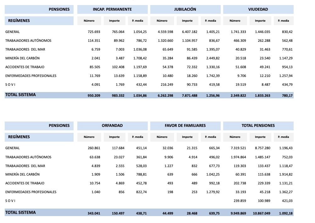 Por regímenes, la pensión media de jubilación procedente del Régimen General es de 1.405,2 euros al mes, mientras que la más baja la registra el Régimen de Autónomos, de 836,7 euros/mes. En la Minería del Carbón, la media de jubilación mensual se sitúa en 2.449 euros y es de 1.395 euros en el Régimen del Mar.