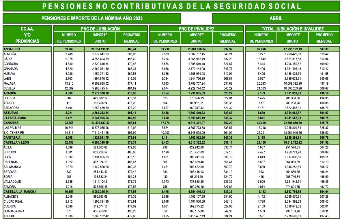 En el mes de abril, en España se han pagado 447.066 pensiones no contributivas a cargo del Estado (con un coste de 227 millones mensuales), según las cifras oficiales del Imserso, que es el organismo encargado de su gestión, aunque la administración corresponde a las comunidades autónomas que tienen transferidas las competencias.