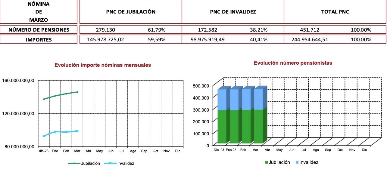 El número total de pensiones no contributivas (PNC) en marzo de 2024 en todo el Estado español alcanza la cifra de 451.712, que representa el 0,30% más que la del mes anterior. Estas pensiones, percibidas por quienes no han cotizado el mínimo de 15 años que exige la Seguridad Social, tienen un importe fijo de 7.250,60 euros íntegros anuales, que se abonan en 12 mensualidades, más dos pagas extraordinarias al año, tal como detalla el Instituto de Mayores y Servicios Sociales (Imserso @Imserso). El coste para el Estado supone 244,95 millones mensuales.