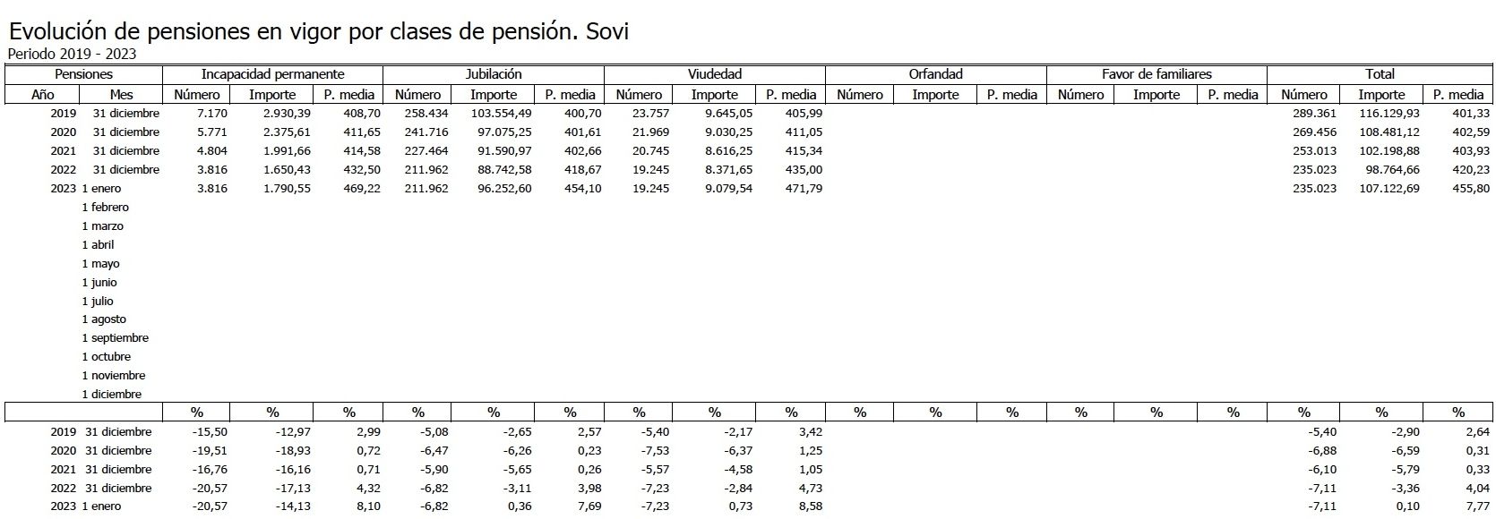 Según las estadísticas de la Seguridad Social, en enero de 2023 las pensiones SOVI tienen un importe medio de 455,80 euros mensuales, una muy baja cuantía para tratarse de un régimen contributivo. No obstante, y pese a lo exiguo de estas pagas, con el cambio de año han experimentado una leve mejoría, puesto que al cierre de 2022 eran de solo 420,23 euros (a finales de julio, según reflejan los PGE, 421,25 euros), en 2021 apenas superaban los 400 euros (en concreto, 403,93 euros al mes), al igual que en 2020 (402,59 euros) y en 2109 (401,33 euros).