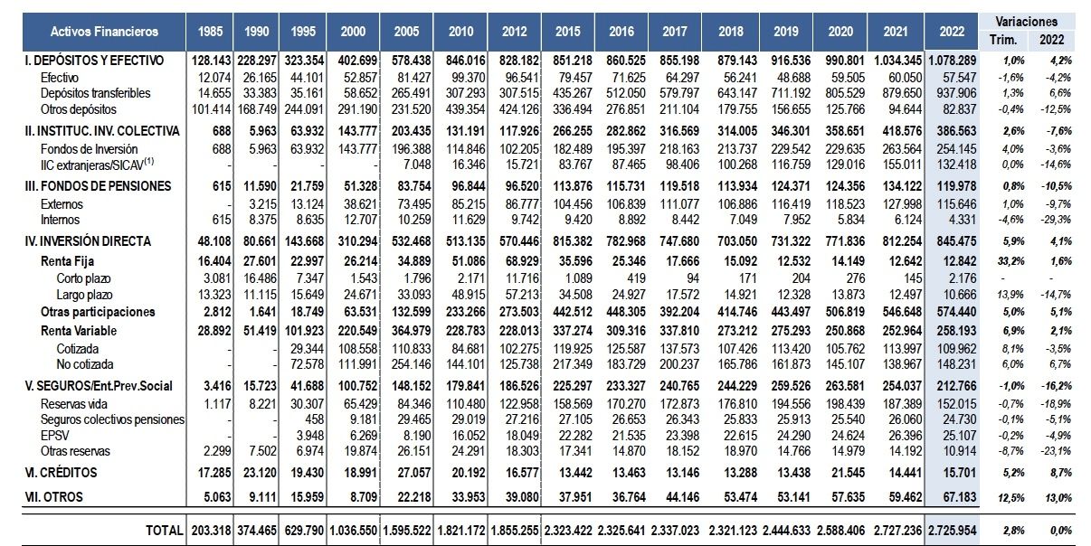 El ahorro financiero (activos financieros) de las familias españolas se situó en 2,73 billones de euros a finales de diciembre de 2022, según las estadísticas de las cuentas financieras de la economía española, difundidas por el Banco de España. Una cifra total que confirma el estancamiento, puesto que el año se cerró en el mismo nivel que 2021, y ello, gracias a que en el último trimestre de 2022, los hogares lograron aumentar su saldo el 2,8% respecto a finales de septiembre; de lo contrario, la riqueza ahorrada habría disminuido.