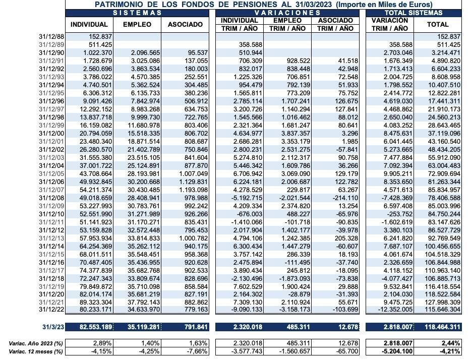 Por sistemas, el patrimonio del sistema individual era, a cierre de marzo, de 82.553 millones, lo que supone un incremento del 2,89% con relación al cuarto trimestre de 2022, pero un descenso del 4,15% respecto a hace un año.