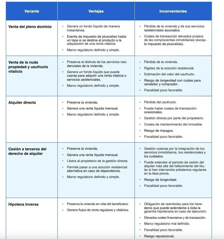 El estudio, realizado por José Antonio Herce y José Antonio Puertas, resalta que "la monetización del activo inmobiliario sería una excelente solución para millones de hogares españoles y, además, sería generalizada debido a la prevalencia de la propiedad de vivienda. De manera que sería una solución beneficiosa y casi universal, si se pudiesen resolver algunos de los principales problemas que se detectan en el mercado de estos productos".