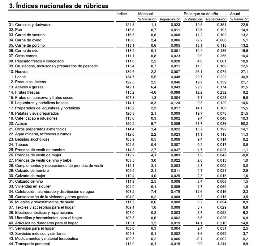 Según los datos del Instituto Nacional de Estadística, entre los alimentos, destaca especialmente el encarecimiento del azúcar, las harinas, la mantequilla, el aceite, la leche o los huevos, que registran incrementos muy superiores al 25%, lo que constata que los bienes de primera necesidad han experimentado incrementos que los hacen prohibitivos para cientos de miles de hogares.