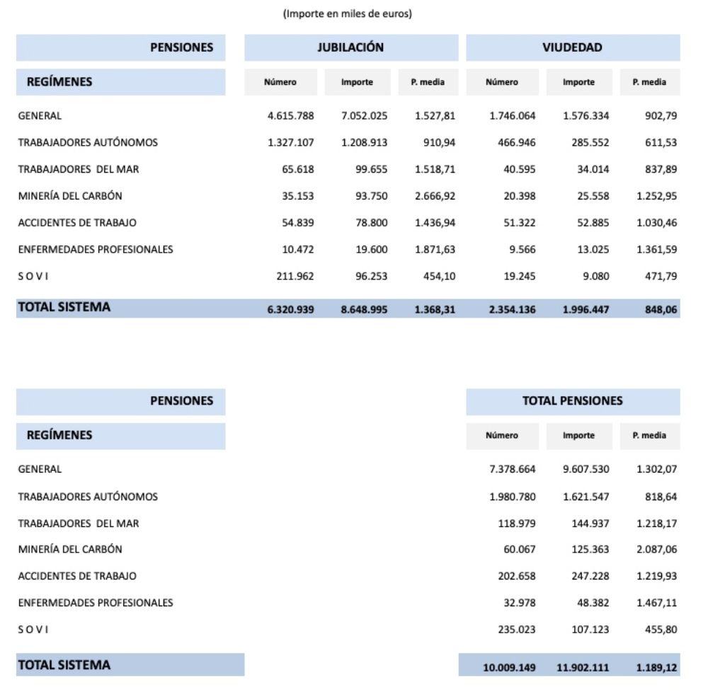 En ese universo de más de 10 millones de pensiones, existe una enorme diferencia en cuanto a las cuantías que ingresan cada mes sus perceptores, incluso dentro de la misma clase de pensión y dependiendo del régimen por el que el trabajador haya cotizado (autónomos, general, minería, mar, etc.). Así, en enero de 2023, la pensión media de jubilación aumenta hasta los 1.368,3 euros mensuales (el 9,8% más que hace un año), mientras que la pensión media del sistema (que comprende las distintas clases, es decir, jubilación, incapacidad permanente, viudedad, orfandad y en favor de familiares) asciende a 1.189,1 euros mensuales, lo que significa que es el 9,8% más elevada que en el mismo mes de 2022.