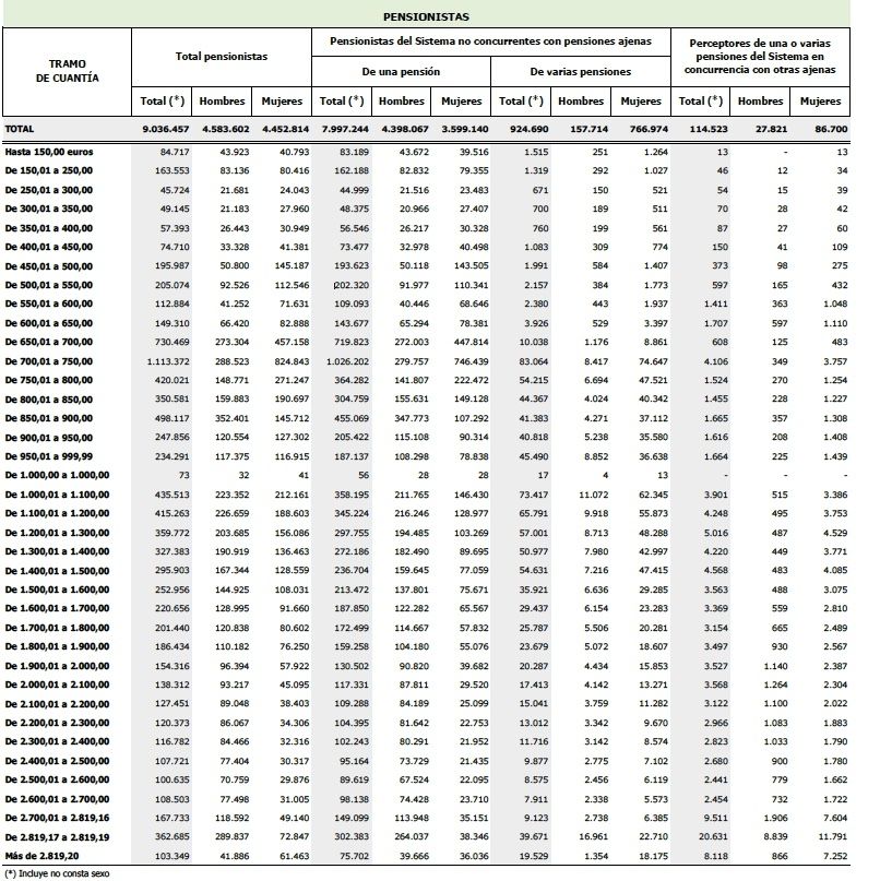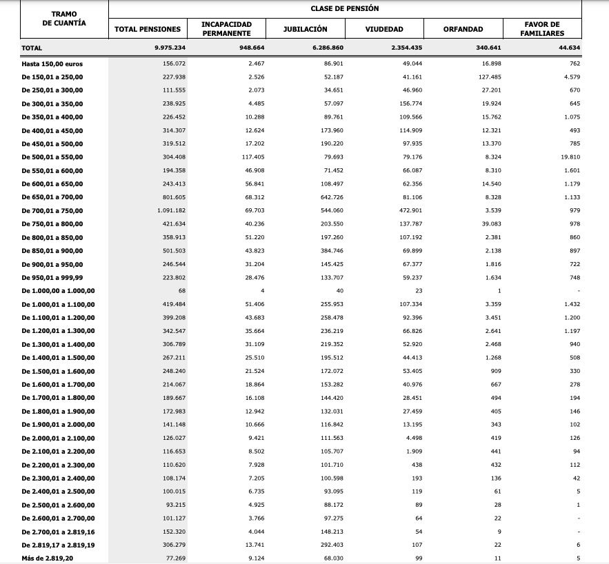 Existen además otras 152.320 pensiones que rozan el máximo, al situarse en un rango entre los 2.700,01 y los 2.819,16 euros al mes.