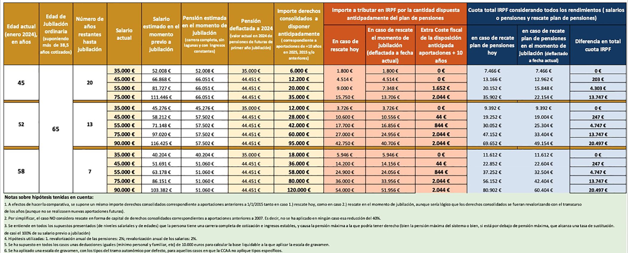 Este sería un ejemplo, con distintos casos de edades y nivel de salarios, de lo que se podría tributar de más por adelantar el rescate, acogiéndose a este nuevo supuesto de liquidez, en lugar de esperar hasta la jubilación o hasta la ocurrencia de otra contingencia: