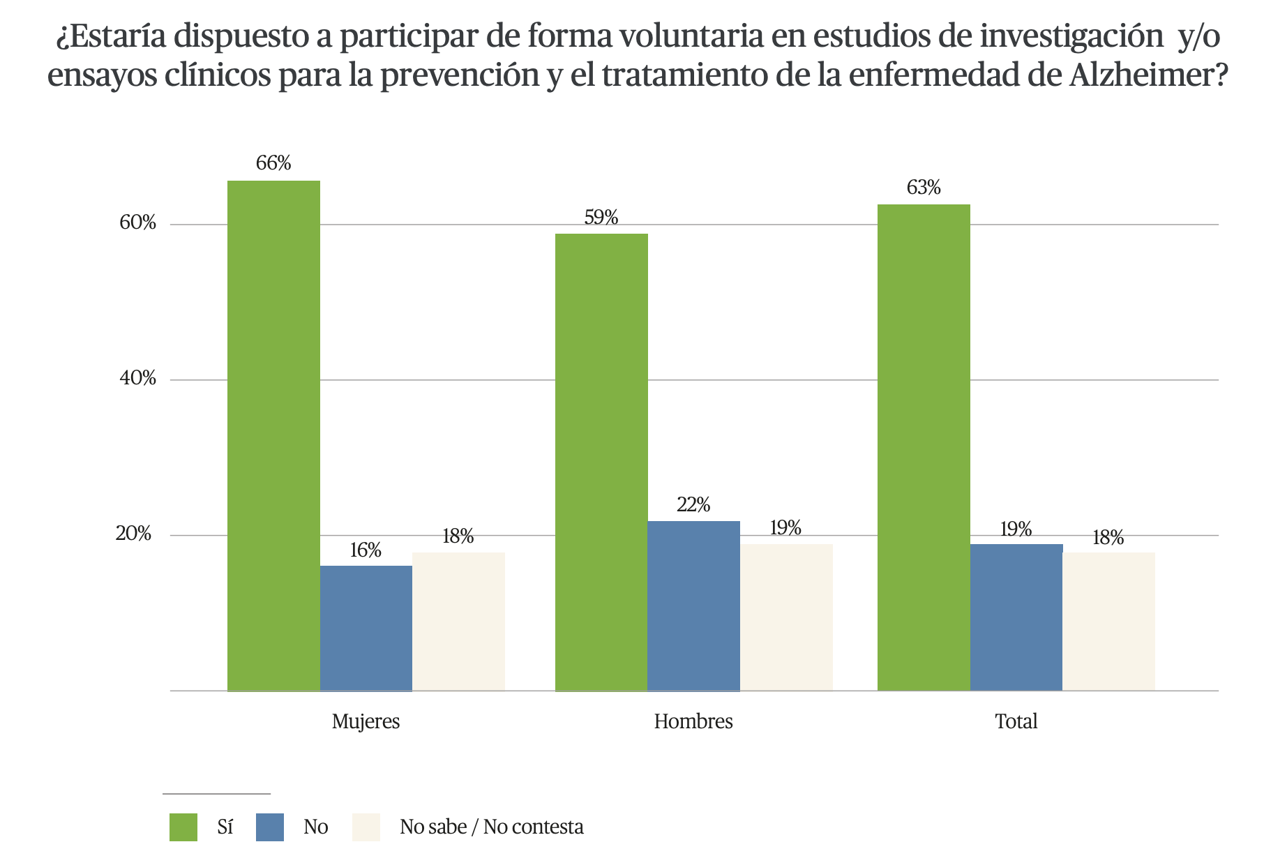 Por otra parte, un 63% estaría dispuesto a participar voluntariamente en estudios de investigación para la prevención y el tratamiento de la enfermedad, 66% en el caso de las mujeres y, 59%, en el de los hombres.